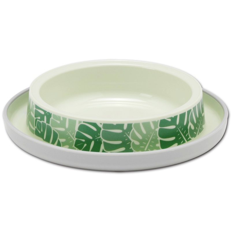 Krásná miska pro kočky s motivem lístků. Miska má širší okraj, chrání podlahu okolo ní před vodou nebo zbytky krmiva. S protiskluzovými podložkami.