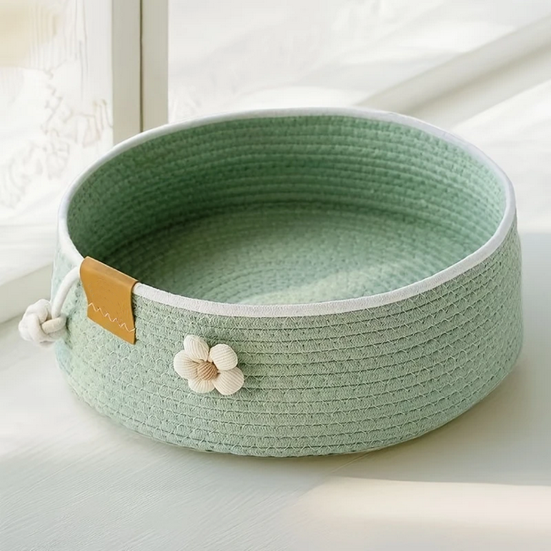 Krásný pelíšek pro kočku v pastelově zelené barvě, s kytičkou a hračkou. Pelíšek je utkaný z bavlny. Je pohodlný, kočička v něm může nerušeně odpočívat a spát. Kočky, které spí rády v klubíčku si ho zamilují.