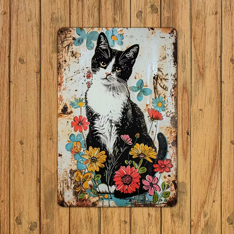 Plechová cedule ze které dýchá nostalgie. Krásný malovaný motiv s černobílou kočičkou mezi květinami. Stylová dekorace pro kočičí domácnost. Hledáte tématický dárek pro milovníka koček? Tato retro cedule mu udělá určitě radost.