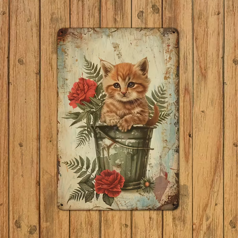 Krásná retro plechová cedule s koťátkem. Roztomilý motiv učaruje každému, kdo má rád kočky. Originální dekorace na zeď, která zútulní kočičí domácnost.