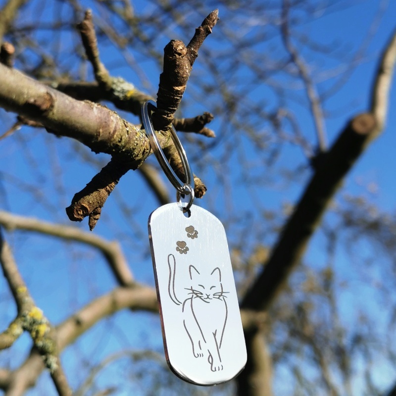 Elegantní přívěsek na klíče s kočičím motivem. Silueta kočky a tlapiček jsou vypáleny laserem. Celý přívěsek je vyroben z nerez oceli, díky tomu je příjemně těžký, v kabelce pak klíče snadno najdete.