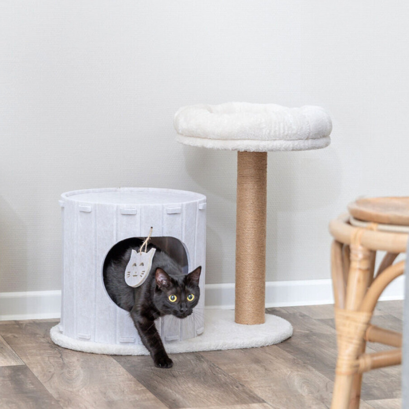 Škrabadlo Filia nabídne vaší kočce prostor pro chvíle hry, odpočinku i pro broušení drápků. Domeček z pevného filcu se zavěšenou hračkou a vyjímatelným poštářkem, škrábací sloupek z juty a plyšový pelíšek - to je kombinace, která uspokojí každou kočku.