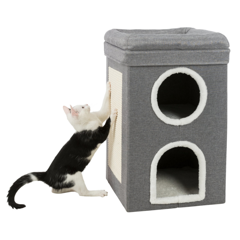 Originální čtvercová věž pro kočky se třemi plochami pro ležení a jednou velkou škrabací plochou. Má dvě jeskyně vystlané měkkým plyšem, a vrchní odnímatelný pelíšek.