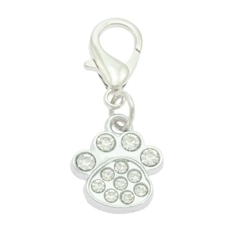 Krásný přívěsek z lesklého kovu ve tvaru tlapky, posázený kamínky a doplněný praktickým zapínáním - karabinkou. Kočičce bude slušet.