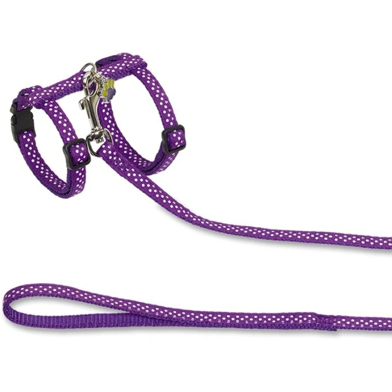 Fialový puntíkatý postroj s vodítkem bude na výletě slušet každé kočičce nebo kocourkovi. Postroj je vyrobený z odolného nylonu. Oproti klasickému obojku obepíná kočce tělo a předchází tak možnému tahání za krk a poškození páteře.