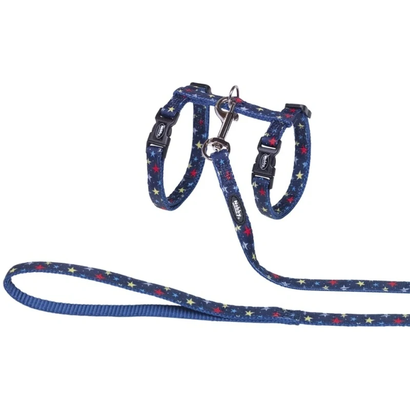 Nobby postroj pro kočku s vodítkem, vyrobený z odolného nylonu, v pěkném designu s hvězdičkami. Oproti klasickému obojku obepíná kočce celé tělo a předchází tak možnému tahání za krk a poškození páteře.