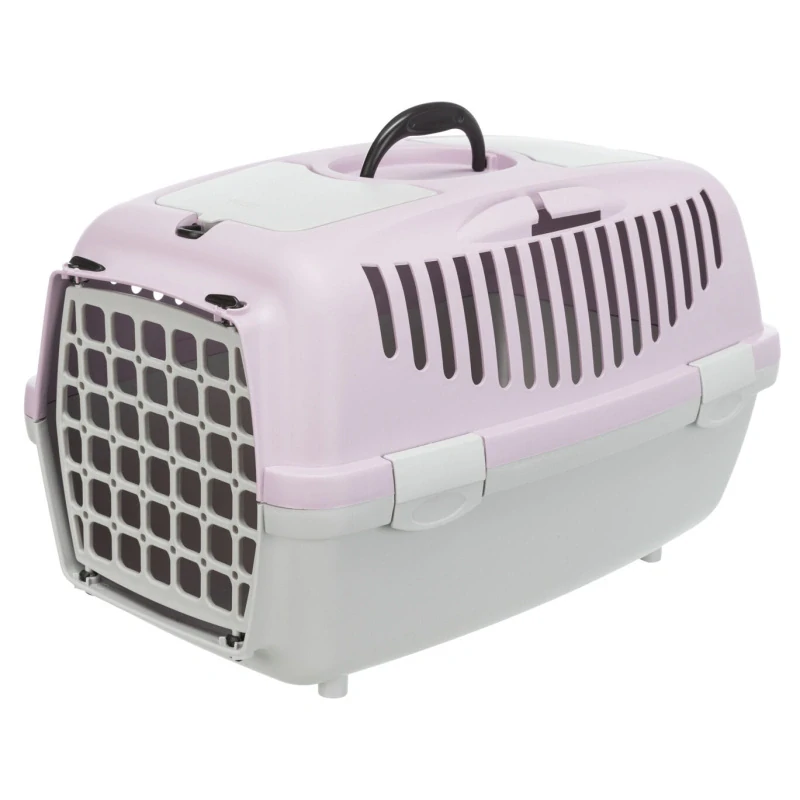 Tato přepravka v krásné pastelové barvě je velikostí vhodná i pro větší kočičky. Má dostatek větracích otvorů, pevné madlo a úchyty pro bezpečností pás v autě.