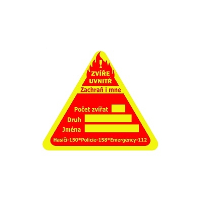 Tato samolepka pomůže udržet vaše mazlíčky v bezpečí v případě požáru či jiného neštěstí i ve vaší nepřítomnosti. Díky výrazným barvám je nepřehlédnutelná. Záchranné složky budou tedy ihned vědět, že se v domácnosti nachází zvířata.
