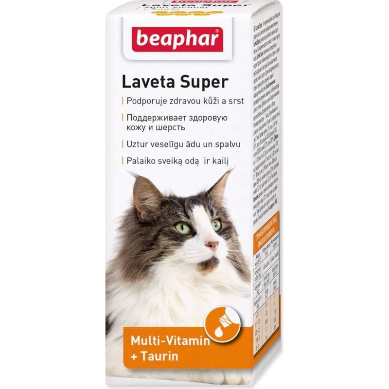 Laveta Super je doplněk stravy pro kočky ve formě kapek. Pro podporu a lepší kondici srsti, zastavuje vypadávání srsti, pomáhá předcházet svědění.