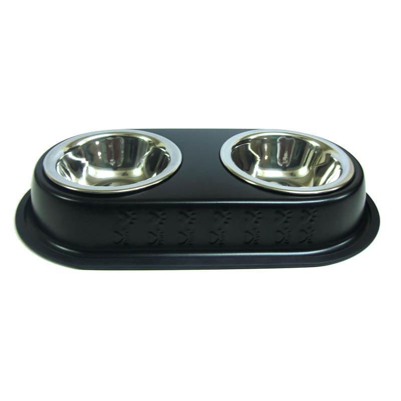 Kvalitní nerezová dvojmiska s reliéfem - motiv tlapiček. Obě nerezové misky jsou opatřeny gumovým kroužkem a tak misky při krmení nevydávají klepající zvuky. Misky je možno vyjmout a umýt v ruce či v myčce.
