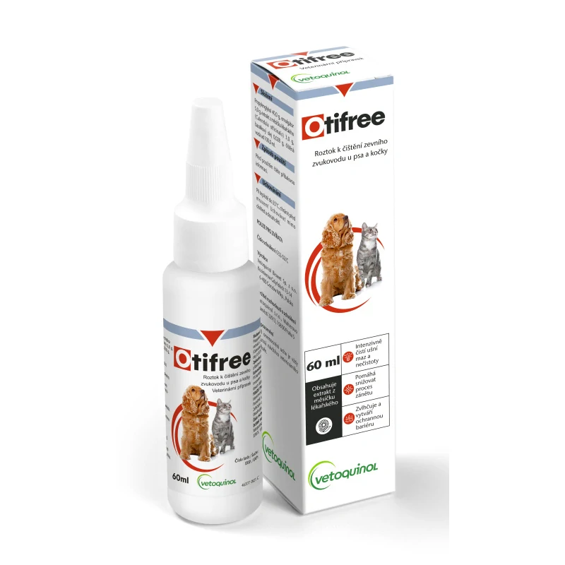 Otifree ušní roztok pro zvířata účinně rozpouští nečistoty a ušní maz, také snižuje počet bakterií a kvasinek přítomných v zevním zvukovodu. Díky vyváženému složení spolu s měsíčkem lékařským nevysušuje a udržuje kůži vlhkou a vláčnou.